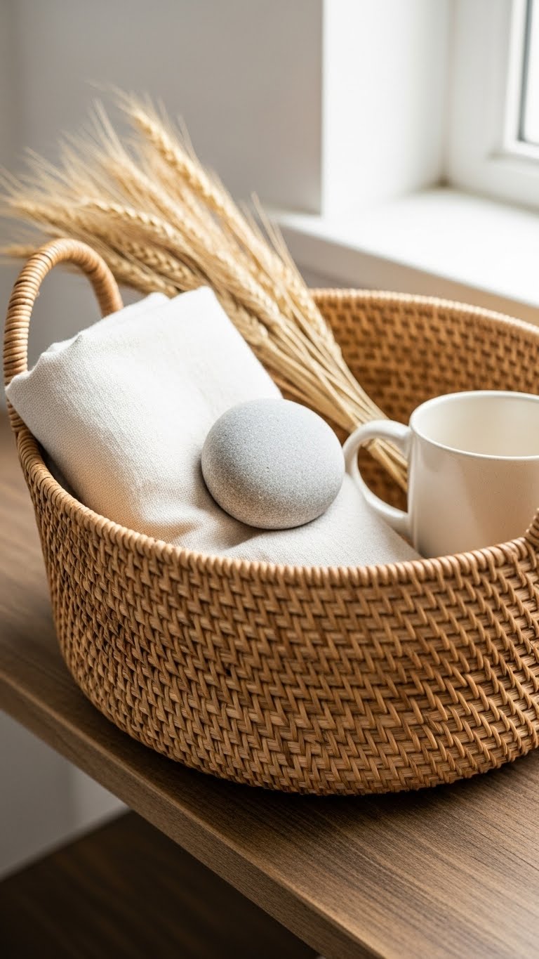 Use rattan baskets for storage. Put on shelves. Fill with essentials. Buy from markets. For DIY, weave strips together. This adds natural touch. Organize clutter fast.