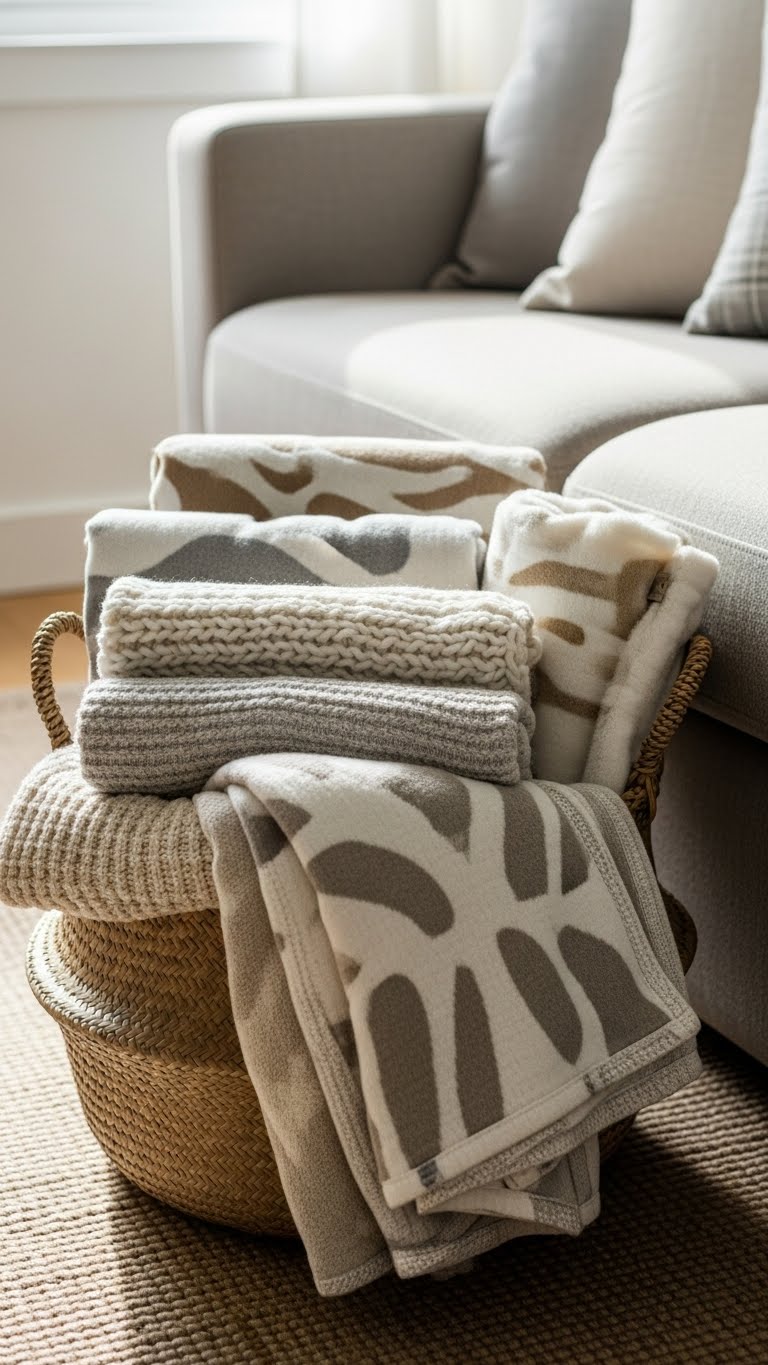 Fold blankets into a basket. Place by seating. Grab when cold. Use thrifted ones. For DIY, knit simple covers. This invites relaxation. Layer for extra comfort.