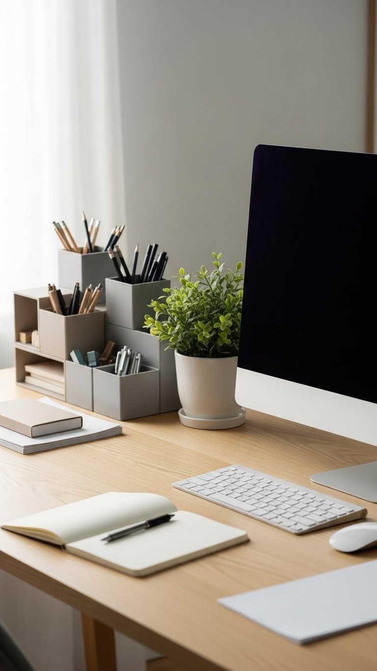 Organize desks with neutral trays. Keep it tidy. Add a small plant. Use recycled items. For DIY, make trays from boxes. This boosts focus. Work efficiently daily.