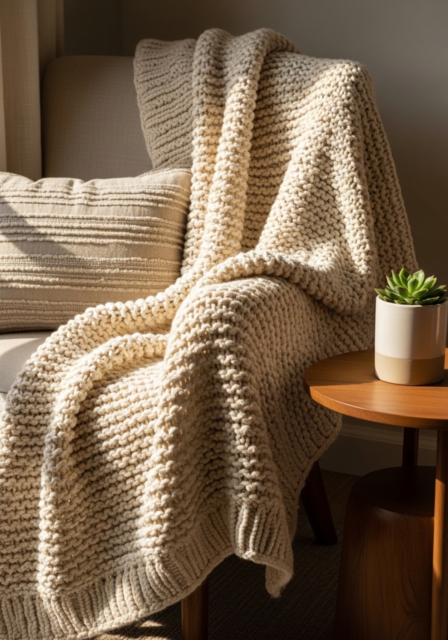 I built a nook by layering this chunky knit throw over a linen-covered armchair and adding a 22-inch euro pillow behind smaller textured cushions. The mix of wool, linen, and velvet feels intentional. Use odd numbers—three cushions—and keep a 2:1 texture ratio (two soft knits to one smooth fabric). Mistake to avoid: too many patterns; keep one subtle pattern and the rest solids.
