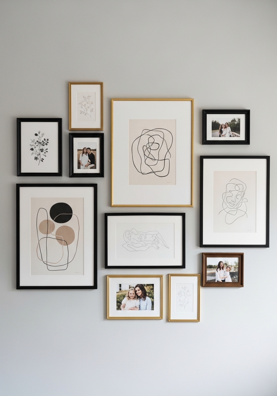 I thrifted frames and added white mats for cohesion. Use vintage-style brass frames paired with matte black ones. Lay the layout on the floor first and keep 2–3 inches between frames. Mistake: hanging them too high—aim for the center at 57 inches.
