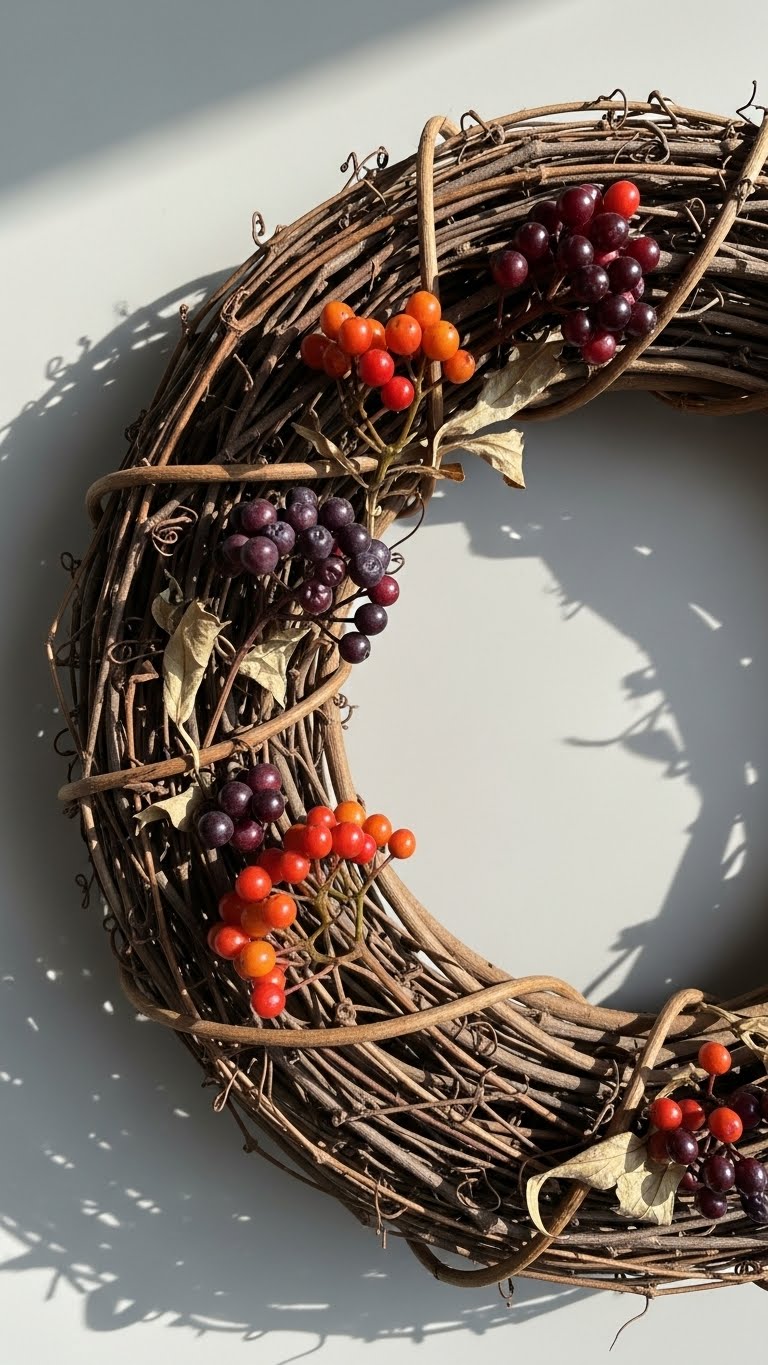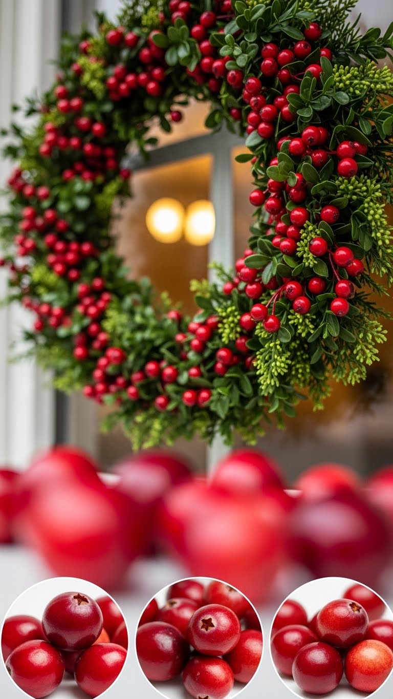 Use fake cranberries from the dollar store to add red highlights. String them onto your wreath base with thread. This adds fun without wilting worries. Spend about $5 on supplies. Begin by spacing them evenly around the circle. Alternate with green leaves for balance. For New Year parties, mix in shiny beads. This setup lasts through January. If you’re short on time, attach with pins. Hang it above your table for gatherings. Kids can help pick the spots. Keep the design light to match any room. Test different arrangements before finalizing.