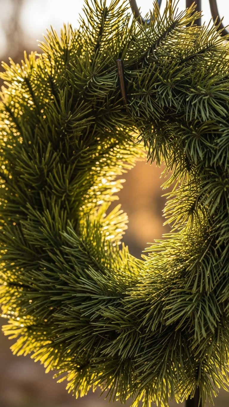 Forage pine needles during a walk. Weave them into a base. Secure with string you have. This is free if you find materials. Take time to sort needles first. Build in sections. For New Year, add a bow from home. Place outside your door. Dry needles in advance for durability. Make it a weekend task.