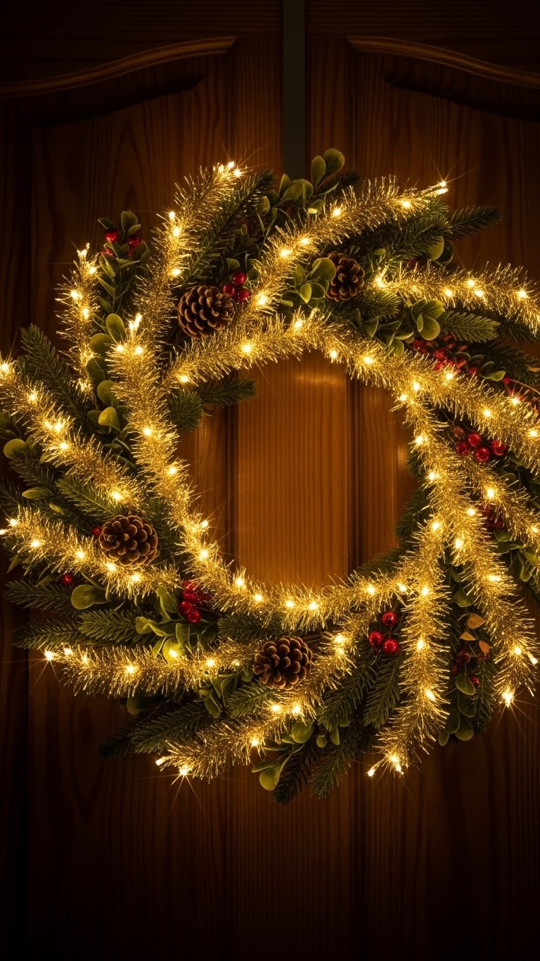 Use old tinsel or buy metallic string low-cost. Wrap it around your wreath. Fasten with clips. Spend under $5. Start at one point and go around. Layer for more shine. Tie in New Year with small lights. Hang in party areas. Reuse tinsel from past decor. Check for even coverage.