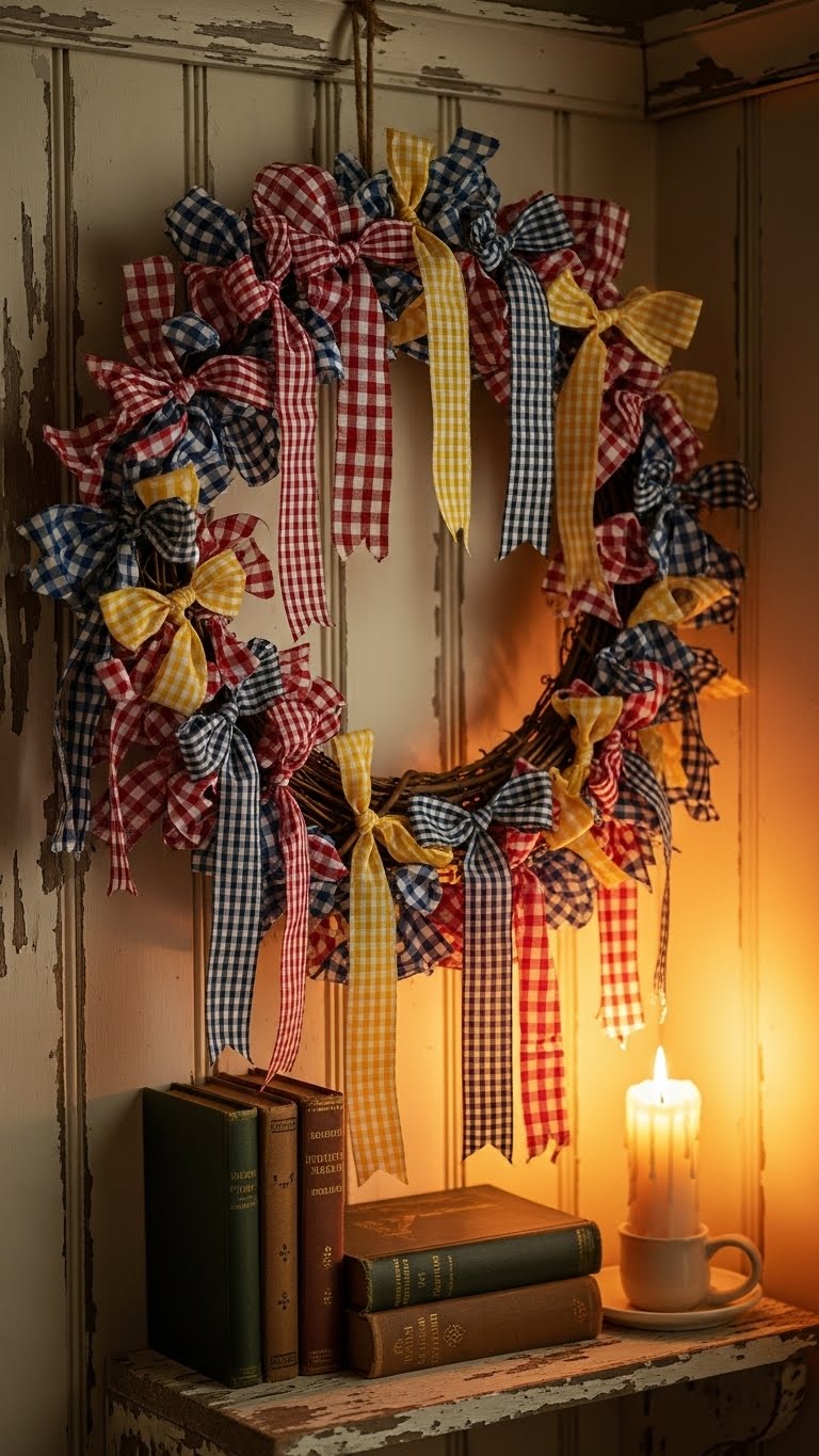 Cut gingham from old clothes. Tie onto a base. Overlap for fullness. Spend nothing extra. Start with even strips. Tie knots firmly. For New Year, add patterns. Place in kitchens. Mix colors creatively.
