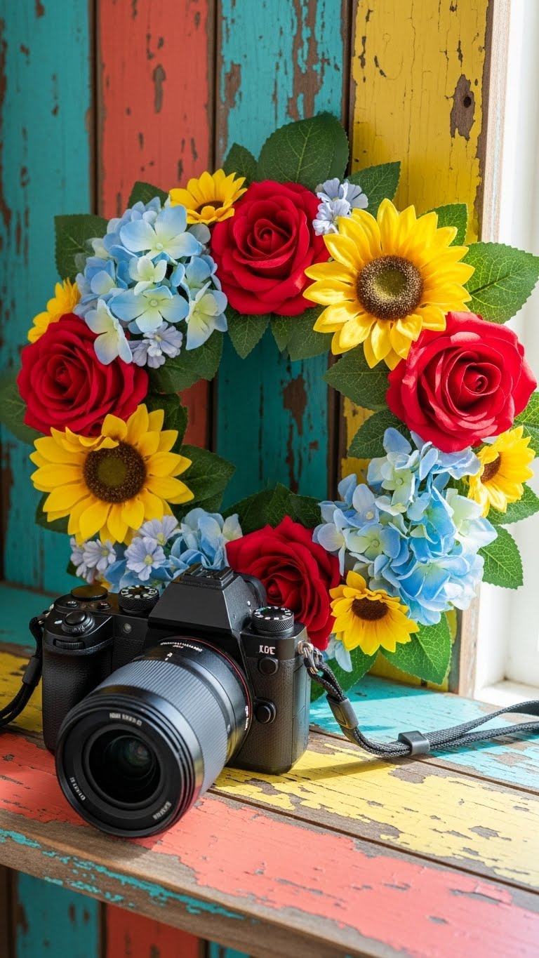 Choose fake flowers from sales. Stick on a frame. Use hot glue. Cost is about $5. Select durable ones. Arrange artfully. For New Year, include faux berries. Keep indoors. Clean easily.