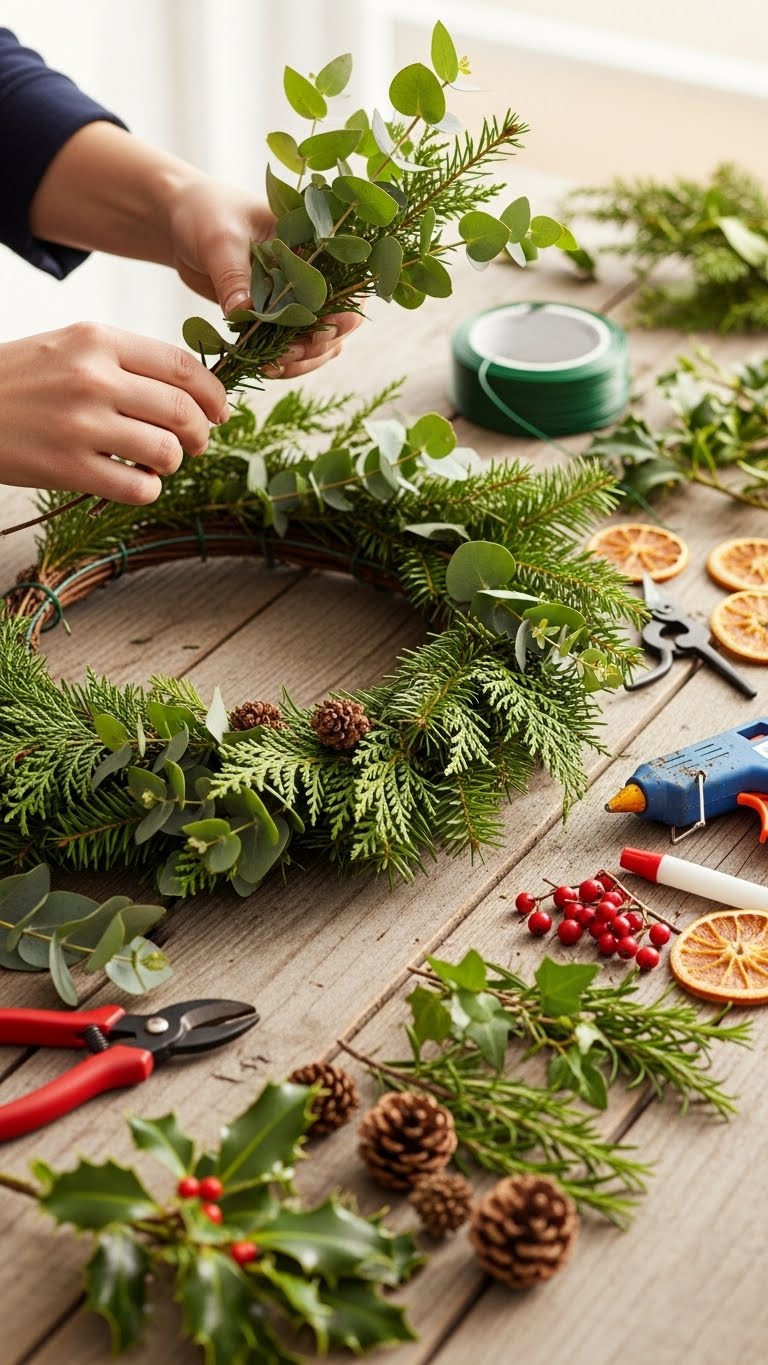 Grab basic evergreen branches from your yard or a local shop. Start by twisting them into a circle shape. Add a few metallic baubles for that New Year sparkle. This keeps costs low at under $10. Try gluing on pinecones you find outside for a personal touch. Break the process into steps: first, secure the base with wire; next, attach accents. You’ll have a wreath ready in 15 minutes. Use old ribbons from last year to save money. This design works for your front door or table center. Experiment with different branch types for variety. Friends will notice the fresh look. Keep it simple to avoid mess. Enjoy how it ties into holiday vibes without extra work.