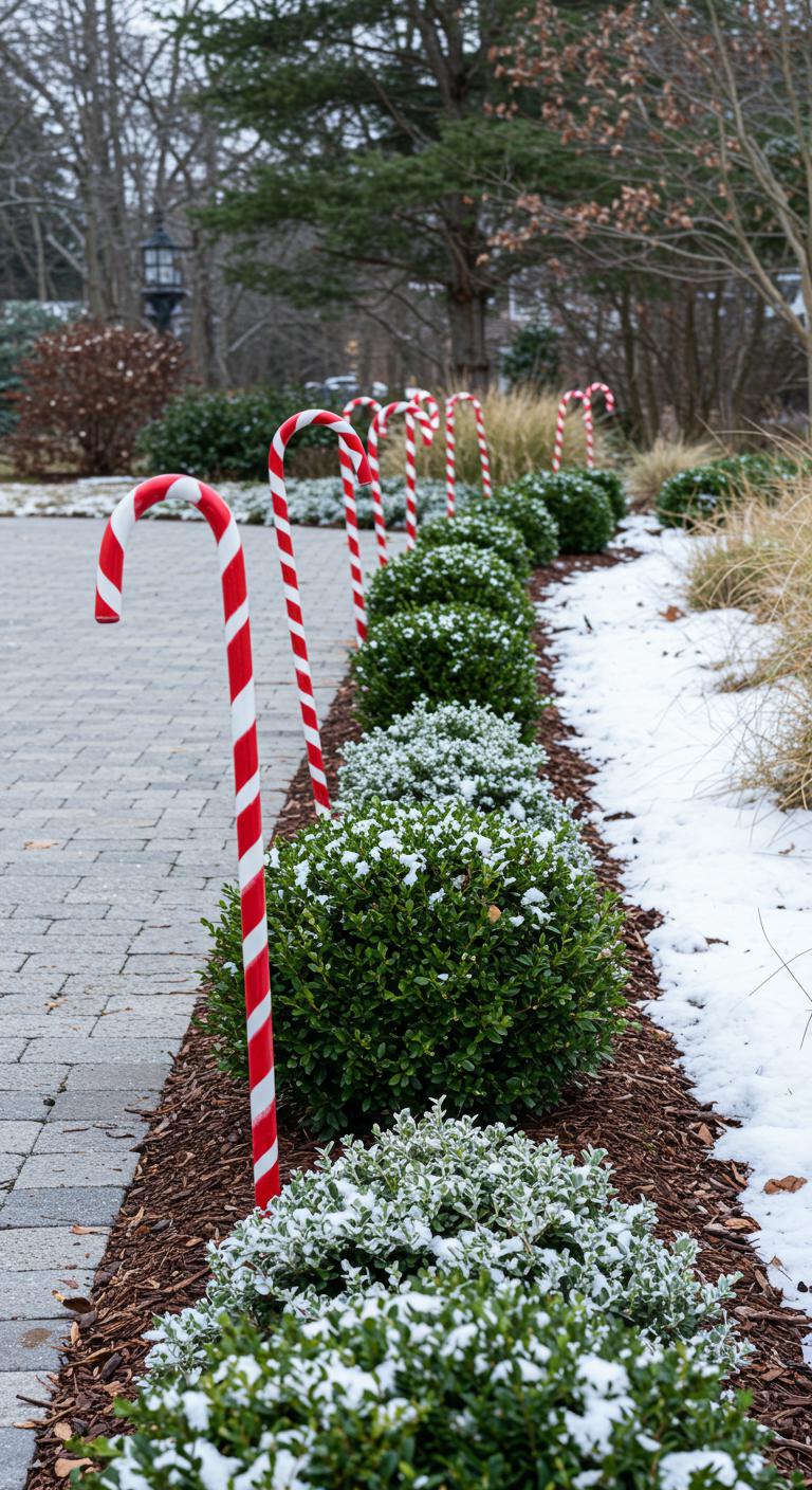 When you line your walkway with oversized candy-cane stakes, you create an instantly festive frame that guides guests and highlights your winter plantings; choose red-and-white poles that stand tall among low evergreens, boxwood hedges, or snow-dusted ornamental grasses so the holiday accents complement—not overpower—your landscape.