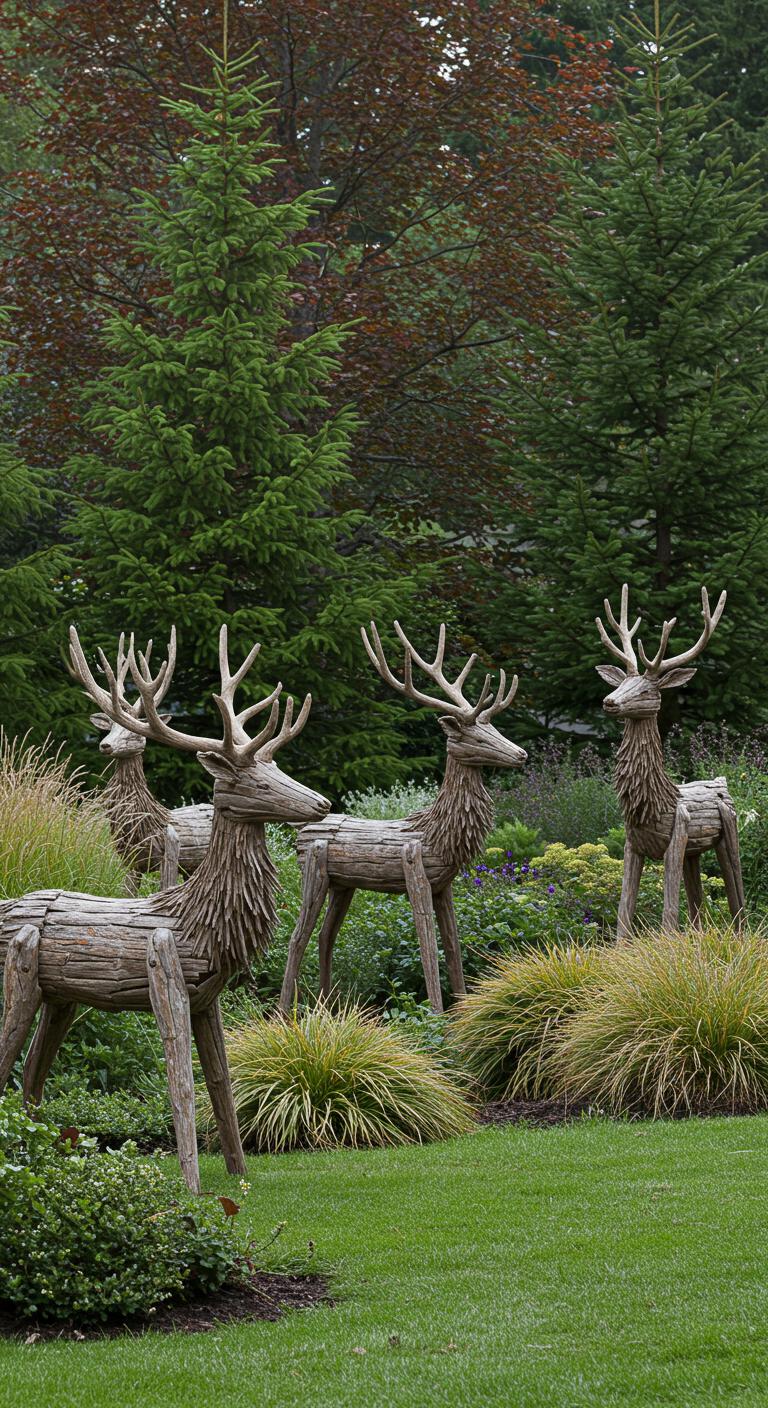If you want a natural, plant-forward focal point, arrange a rustic wooden reindeer herd along garden beds or near groves of evergreens to echo seasonal textures and silhouettes. You’ll place varied heights to mimic movement, tuck native grasses around bases, and weather the wood for rustic charm. The reindeer silhouettes guide sightlines and invite relaxed wandering, letting your yard feel free and intentional.