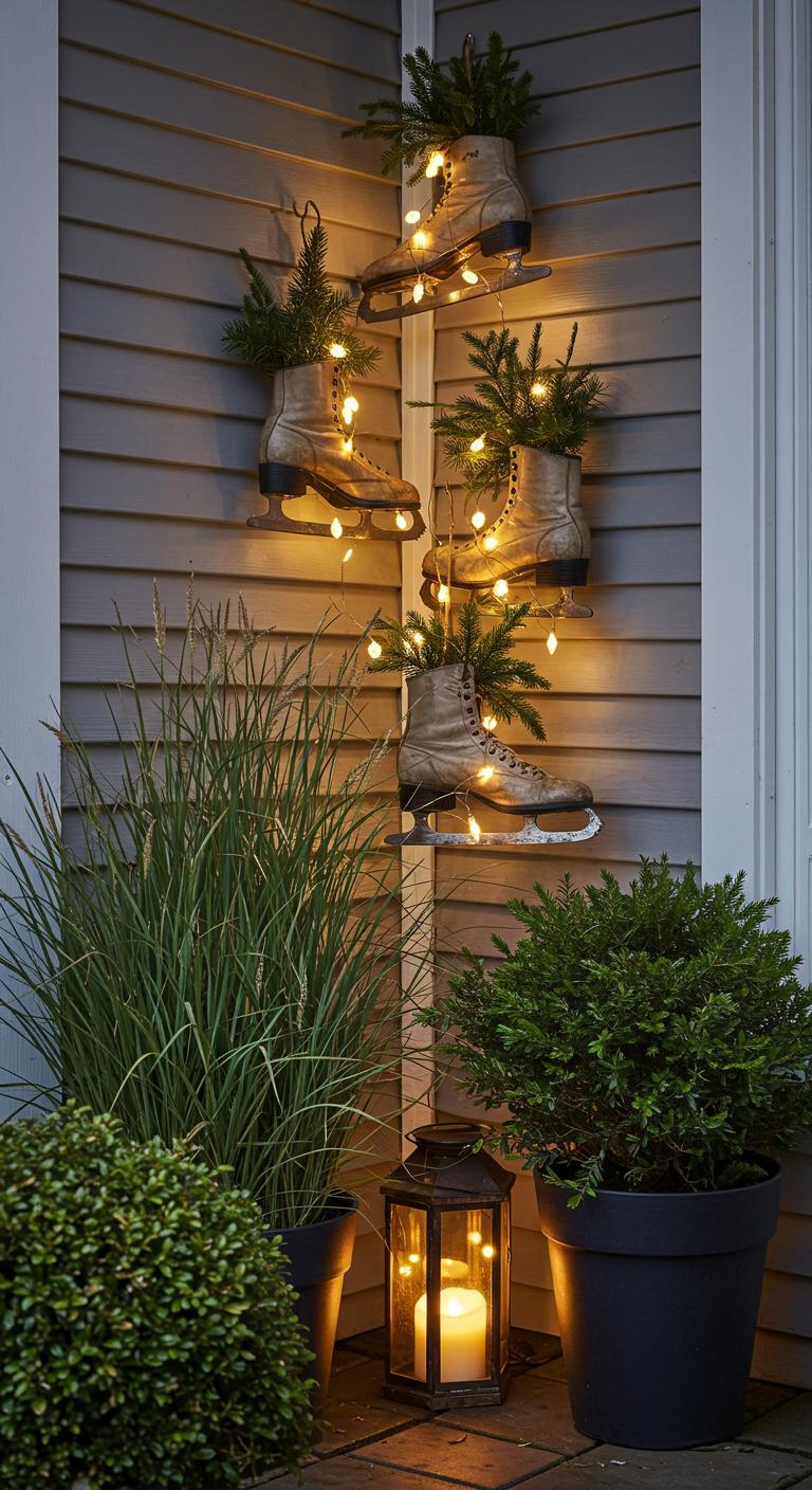 When you hang a pair of vintage-style skates strung with warm fairy lights among upright ornamental grasses and compact evergreens, they transform a porch corner into a sculptural, plant-forward focal point.