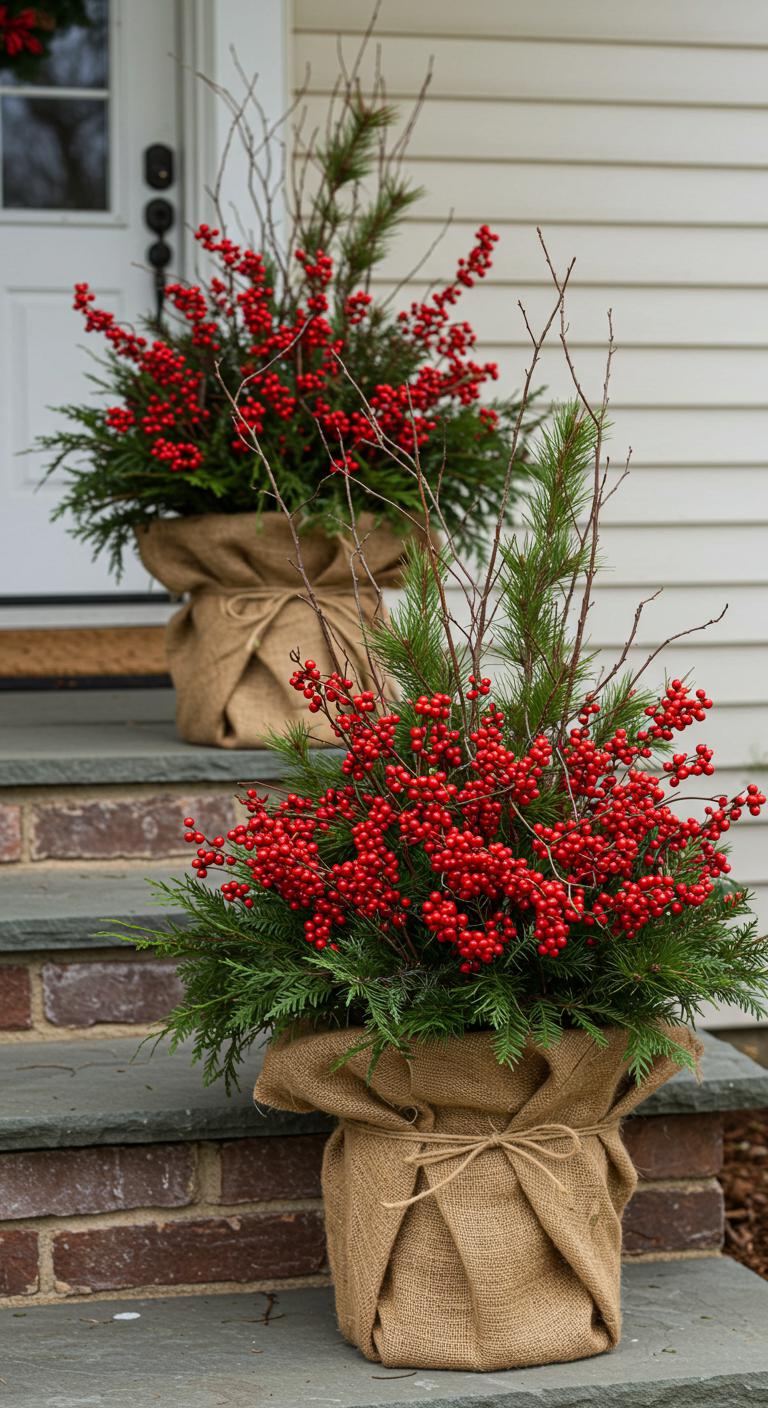 A pair of burlap-wrapped planters flanking your front steps gives a simple, textural welcome that feels both rustic and refined; tuck clusters of hardy red berries, clipped evergreens, and a few sculptural stems into the burlap for contrast, then secure the fabric with twine so it withstands wind and moisture.