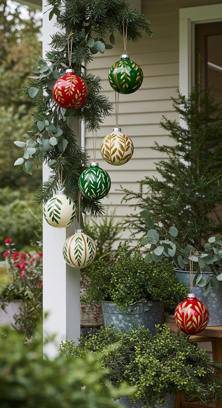 You can carry the burlap-and-berry mood onto your porch by adding hand-painted outdoor ornaments that sit among greenery or hang from hooks.