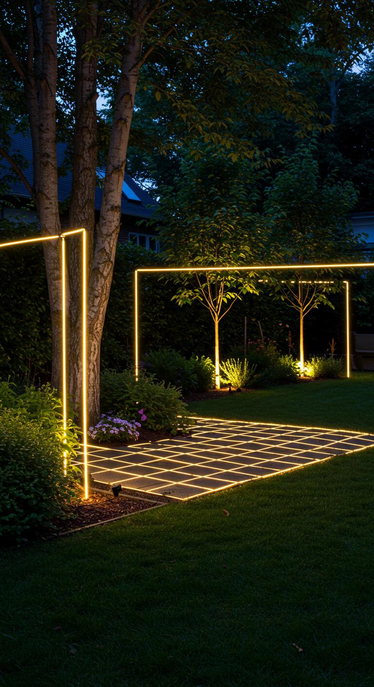 Clean geometry and the soft glow of LEDs make a modern minimalist light grid an elegant way to dress your yard without overwhelming nearby greenery.