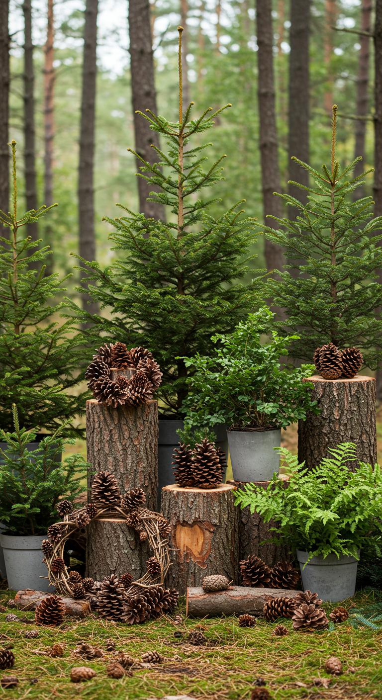 When you layer natural textures—needled evergreens, rough-barked trunks, and rustling ferns—pinecone accents feel like they’ve always belonged, so place them where they echo the plants’ scale and rhythm.