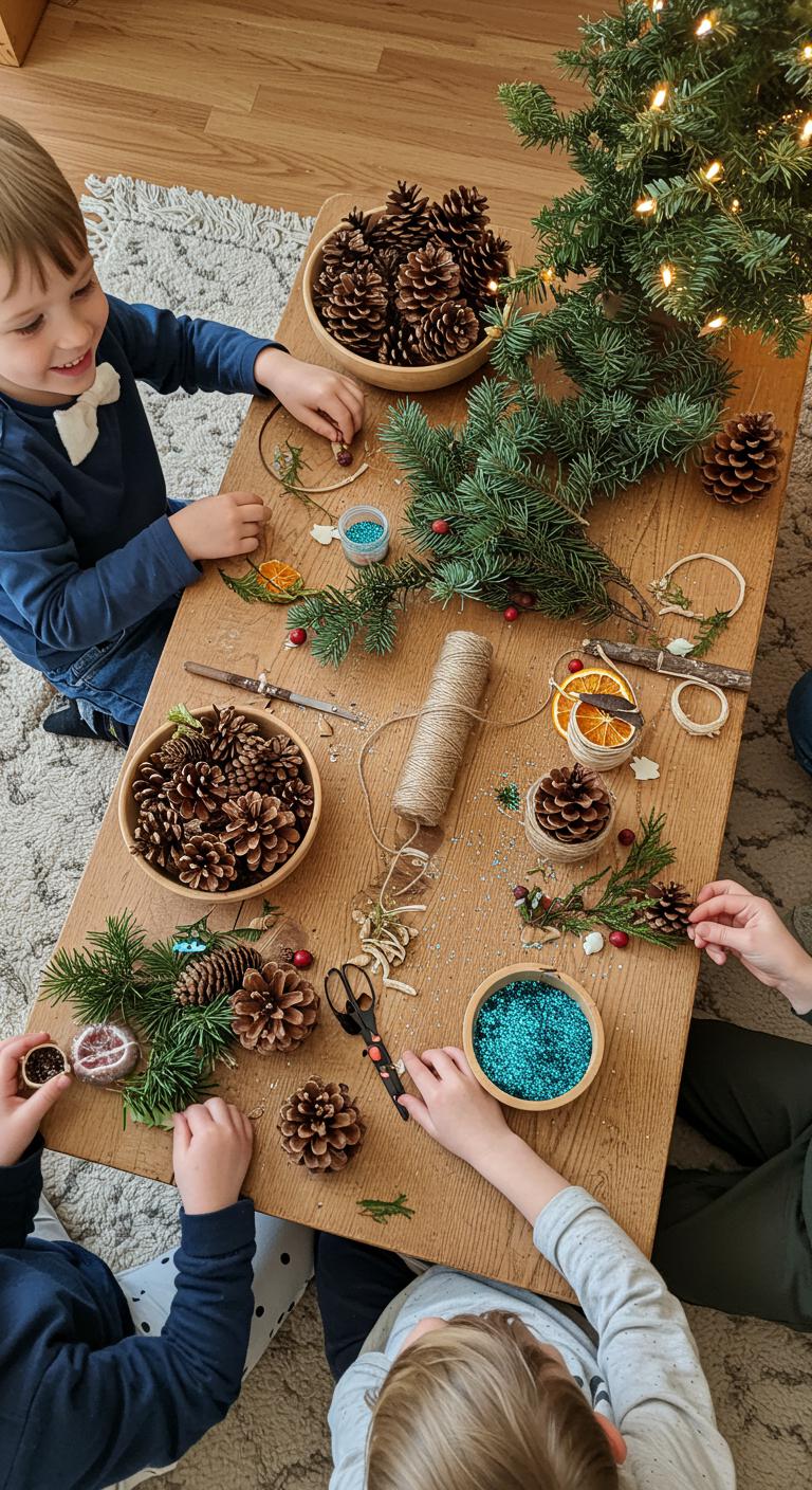 Although it sits at the edge of your larger display, a Children’s Craft Corner gives kids a tactile way to join the holiday decor by using natural materials and simple tools.