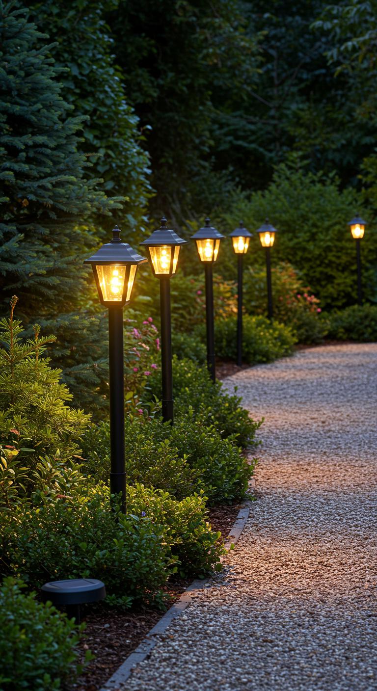 You’ll choose solar powered lighting that complements plant textures, spacing posts to create rhythm and depth.