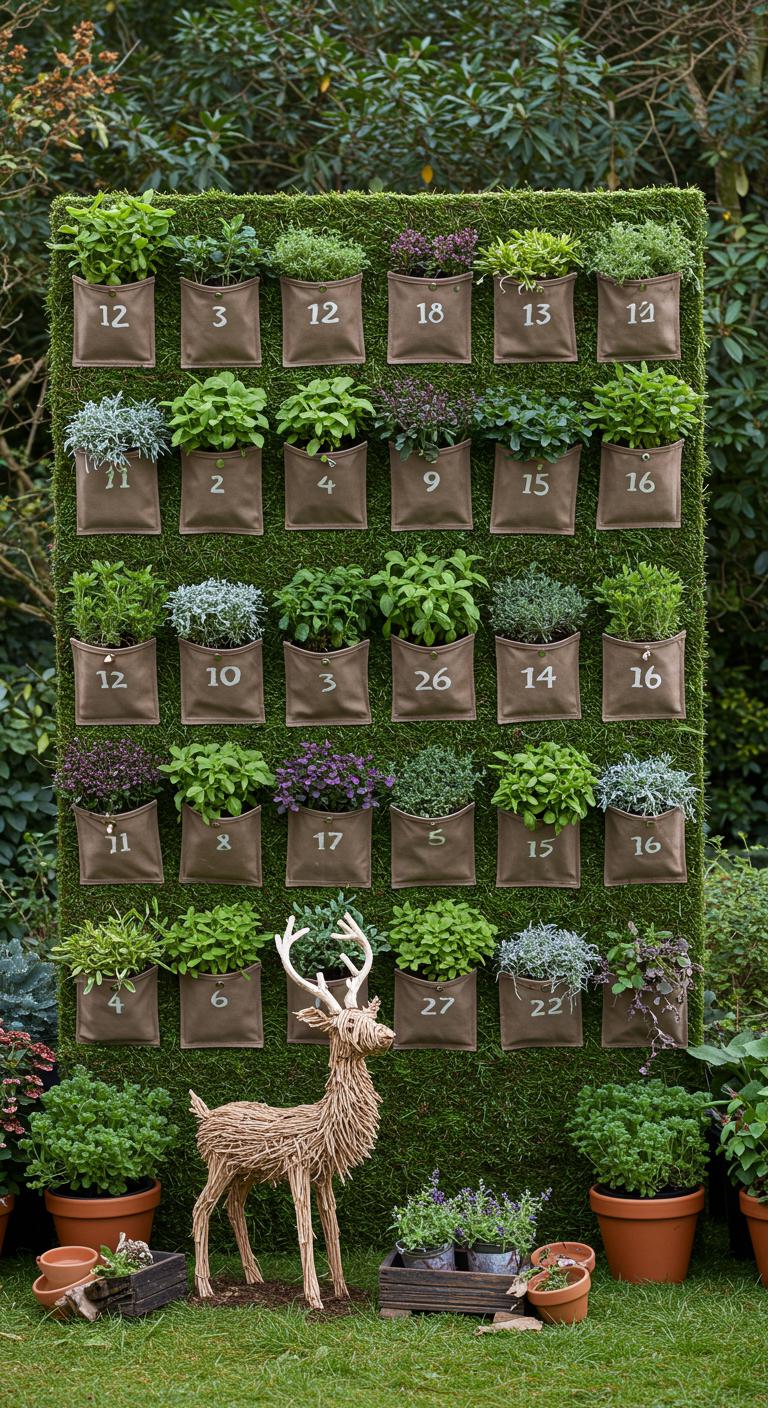 You’ll assign 24 pockets or pots—evergreen sprigs, potted herbs, small planters—numbered for a holiday countdown.