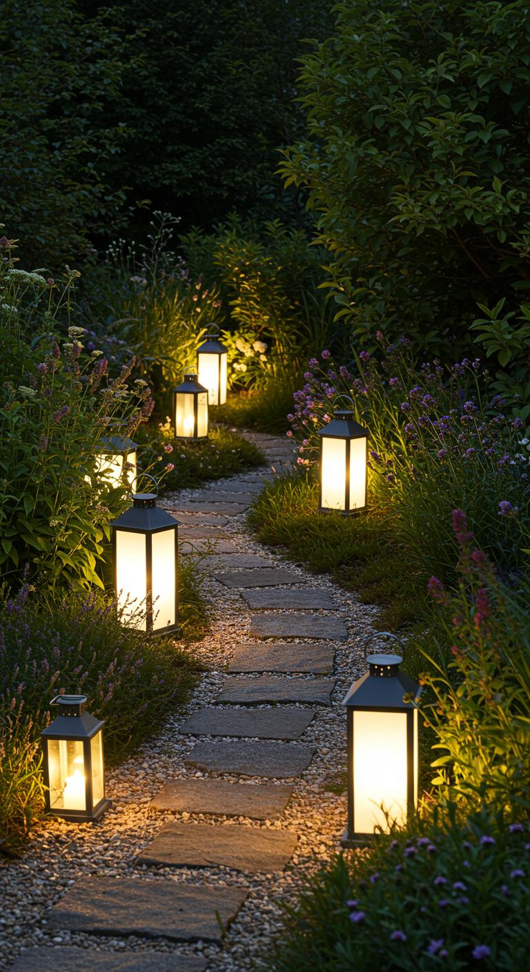 You’ll pick lantern styles that echo your plants, use battery or low-voltage walkway lighting, and space them to highlight textures and blooms.