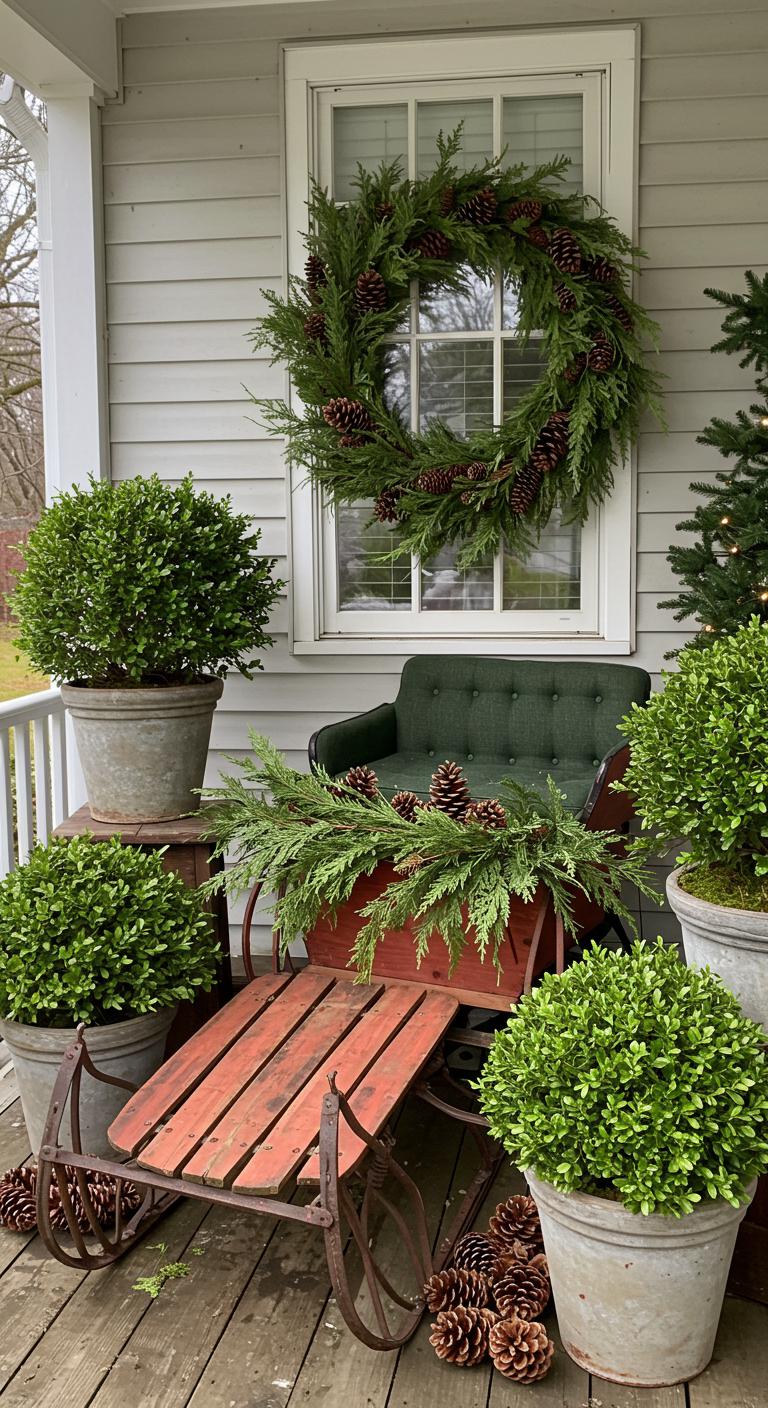 Move from softly lit paths to a porch display that feels like a found heirloom—set a vintage sleigh as the focal point and arrange potted evergreens, clipped boxwood, and swags of cedar to echo the garden beds.