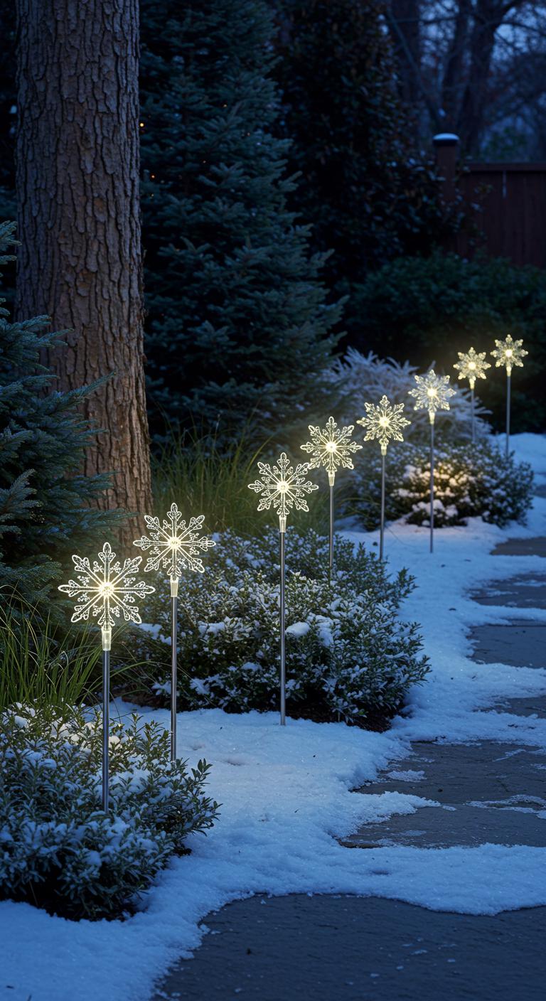 When you stake luminous snowflakes along a walkway or among low evergreens, they turn simple beds into a winter constellation that highlights plant textures and seasonal shapes.