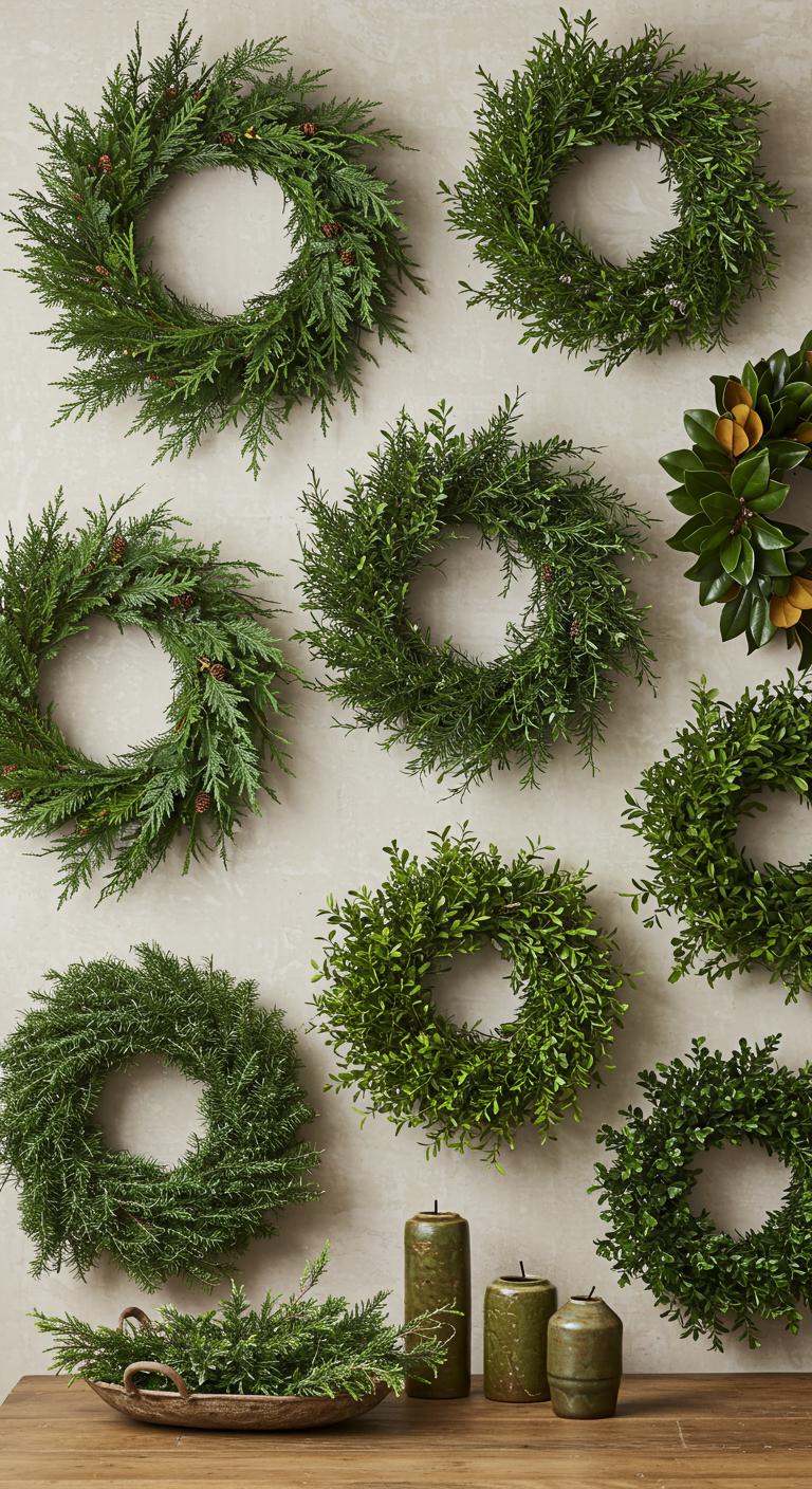 If you want to make an imposing seasonal statement without crowding your porch, a curated evergreen wreath wall gallery does the trick: mount a mix of wreaths—cedar, fir, boxwood, and magnolia—at staggered heights to celebrate different textures and shades of green.