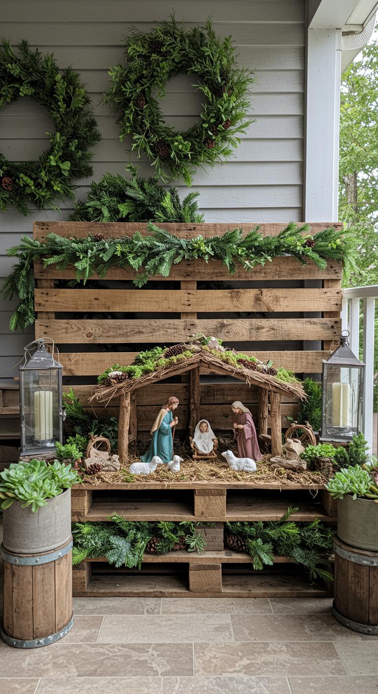 After your evergreen wreath wall gallery sets a lush backdrop, an upcycled pallet nativity scene brings a rustic, plant-forward focal point to the yard that won’t overwhelm the porch.