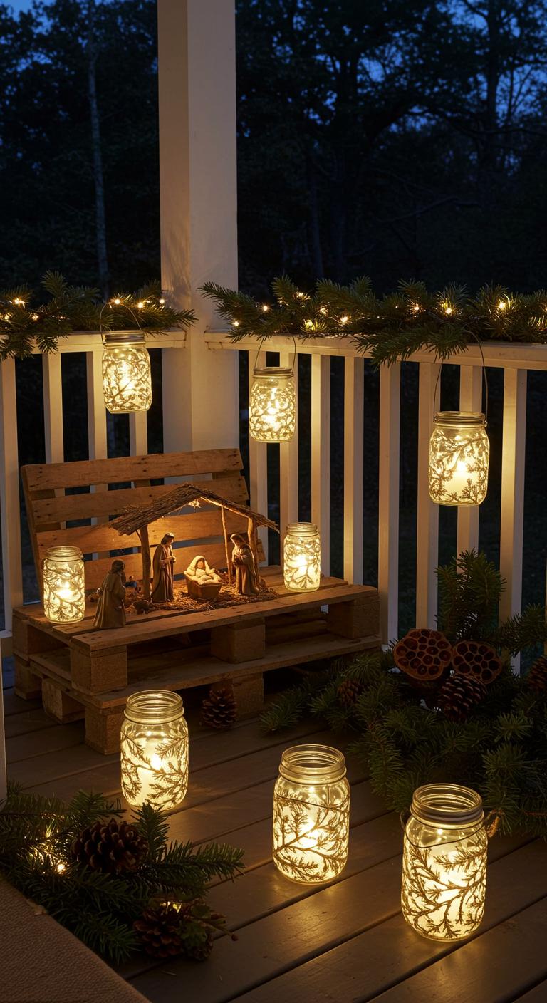While the pallet nativity warms the porch with texture, festive mason jar luminaries add soft, plant-reflective light that draws the eye without stealing the show.