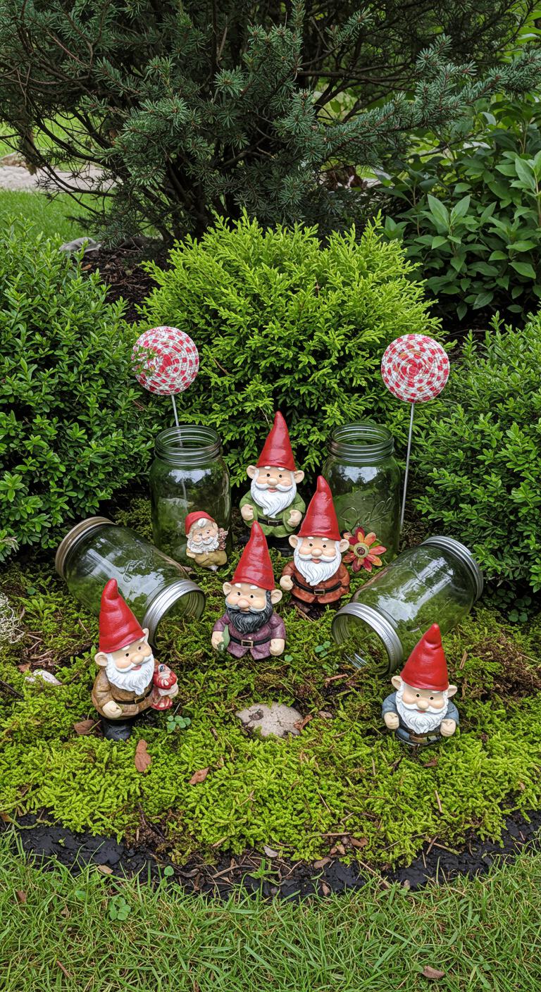 Move a few mason jars aside and let a cluster of cheerful gnomes take center stage in a corner of your porch or garden bed. You’ll choose hardy evergreens, low shrubs, and mossy groundcover to frame them. Select gnome accessories that echo plant textures and pick garden placement for balance and whimsy. You’ll enjoy a liberated, low-maintenance seasonal vignette.