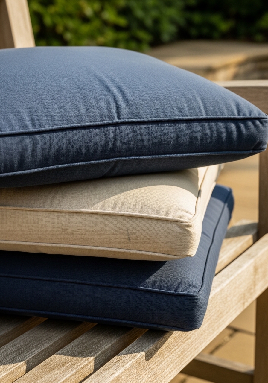 I swapped thin seat pads for 4-inch foam cushions in navy Sunbrella fabric. They wipe clean and survived a summer storm. I bought navy Sunbrella cushions 20×20 and waterproof tie-on pads. Tip: pick fabrics labeled UV- and mildew-resistant. Mistake: buying thin cushions that flatten in a month.