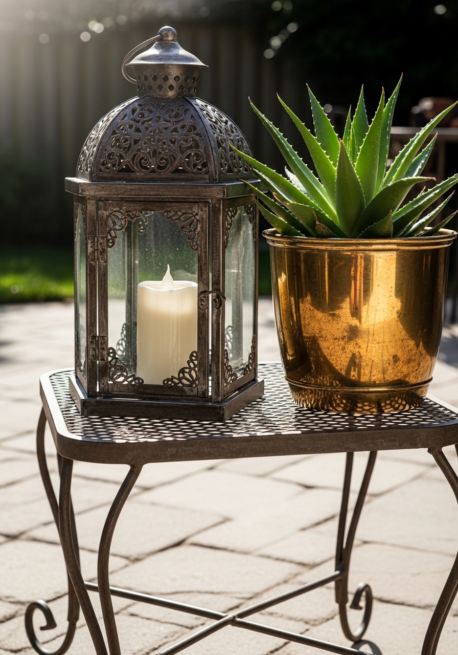 I layered black iron planters, brass candle holders, and copper trays. The mix feels curated, not matchy-matchy. I used black iron planter and brass tealight holders. Tip: stick to two dominant metals and one accent. Mistake: using four or more metals — it reads scattered.