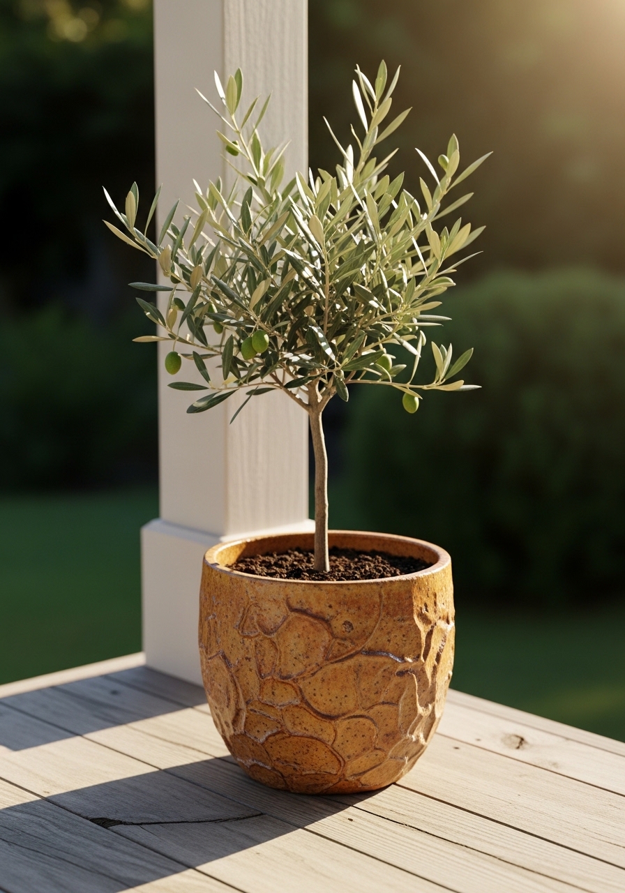A 6-foot potted olive tree adds height and Mediterranean vibes. I used a 20-inch ceramic planter. I bought 6ft faux olive tree and 20" ceramic planter. Tip: choose lightweight faux options for balconies. Mistake: planting trees in small pots without root room.
