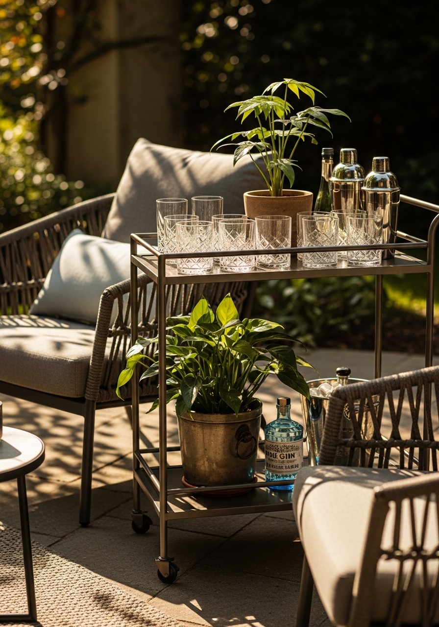 I rolled a bar cart with a decanter and tumblers next to my dining set. It feels luxe and handy. I used outdoor bar cart and acrylic tumblers set. Tip: keep bar tools in a tray to avoid spills. Mistake: overloading the cart — it should remain mobile.