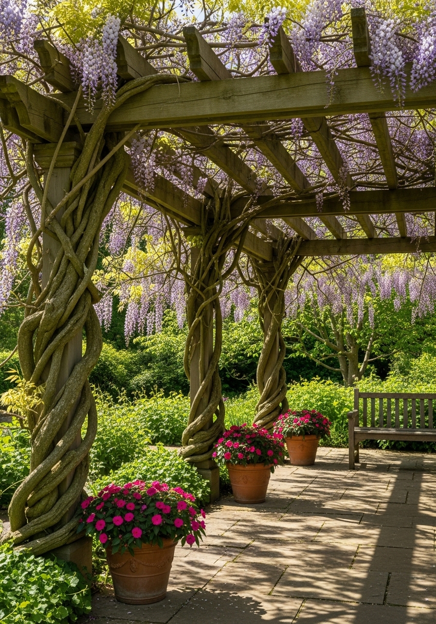 Pergola With Climbing Vines For Soft Shade