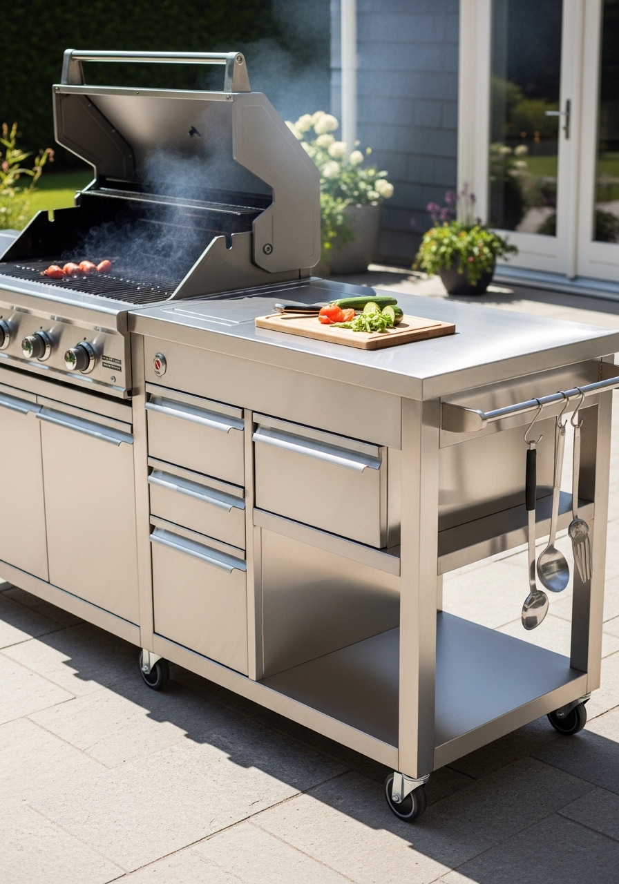 A stainless prep cart changed how I host. It stores tools and keeps food off the grass. I used stainless prep cart and waterproof cutting board. Tip: pick carts with lockable castors. Mistake: placing the cart too far from the grill.