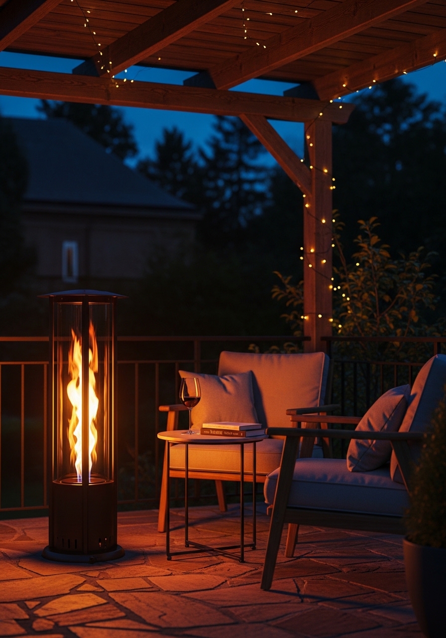 I added a propane patio heater lantern to extend evenings into fall. It warms a 10-foot radius. I used propane patio heater lantern and propane tank cover. Tip: place on level ground and keep 3 feet from combustibles. Mistake: cheap heaters with uneven flame output.