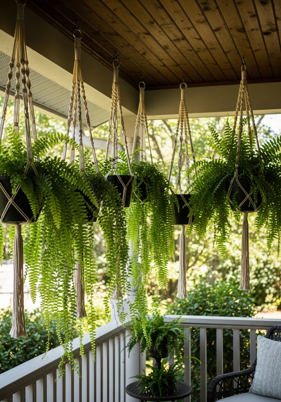 I hung three macramé planters with ferns to add layers overhead. They make the space feel lived-in. I used macrame plant hanger set and 12" hanging planters. Tip: vary hanger heights by 12–18 inches. Mistake: hanging too low above seating.