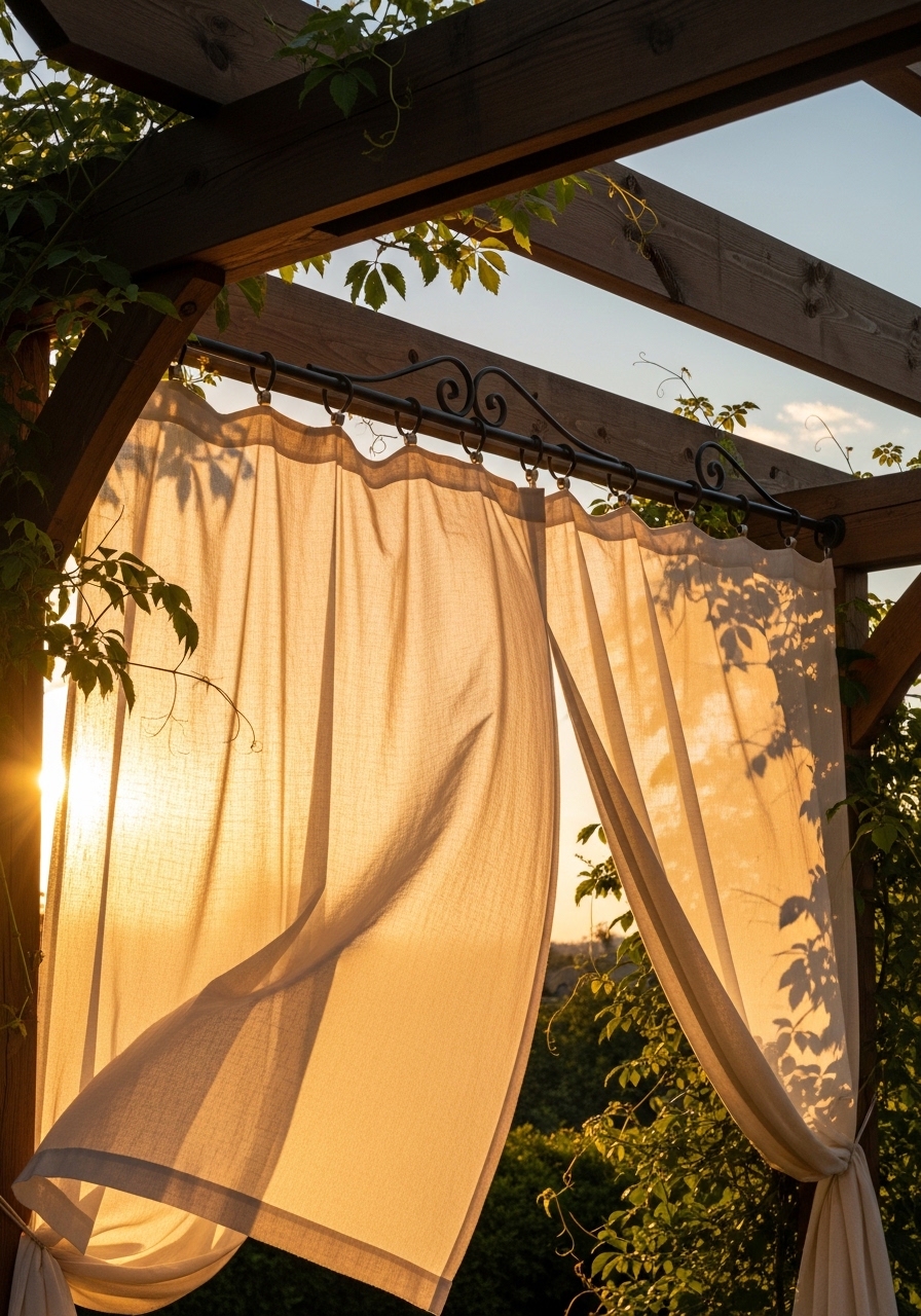 I installed ceiling-mounted curtains across my pergola. I chose white linen-look outdoor panels, 96 inches long, to make the space feel taller. I bought outdoor curtain panels and a ceiling-mounted track kit. They offer privacy and still let light through. Styling tip: use tiebacks at seating height for a layered look. Common mistake: panels that are too short—always go longer for drama.