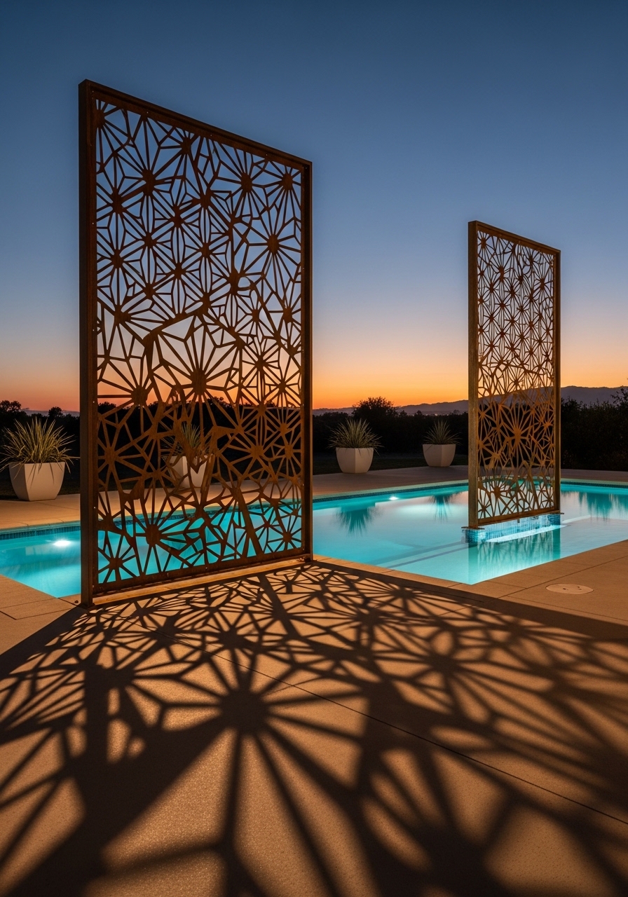 I stood a pair of laser-cut steel panels behind my sofa and they became the focal point. I bought two 6 x 6 ft panels in corten steel look for $350 each from an online seller. I linked similar laser-cut metal panels and galvanized mounting brackets. The front-lit patterns cast beautiful shadows at sunset. Styling tip: backlight them for evening drama. Common mistake: poor anchoring—metal is heavy and needs proper footing.