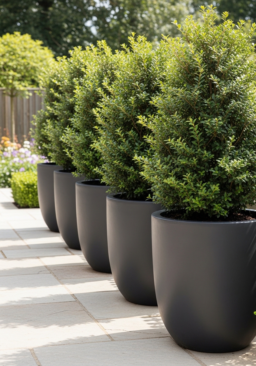 I placed five 24-inch pots with Thuja Green Giant along one side of my patio. They created an evergreen barrier that blocks sightlines in winter too. I bought 24-inch plastic planters and Thuja saplings. The look is formal and private. Styling tip: use matching pots for a unified line. Common mistake: under-potting trees—choose pots large enough for root growth.