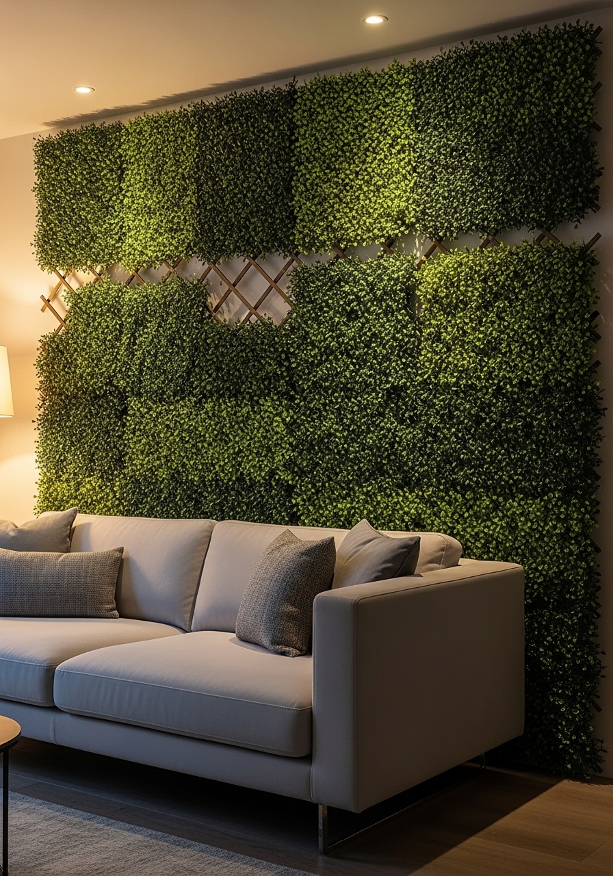 I clipped artificial boxwood panels to a wood trellis for an instant green wall that needs no watering. The 2 x 2 ft panels snap together. I used artificial boxwood panels and a wood trellis frame kit. Real boxwood works too, but demands pruning. Styling tip: mix real and faux textures for depth. Common mistake: using low-quality faux that looks plastic—choose UV-resistant options.