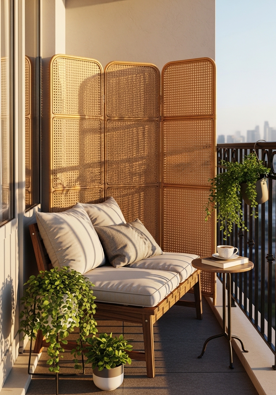 I use a three-panel rattan folding screen to block the neighbor's window on my small balcony. It folds away when I want the view. I bought three-panel rattan screen 60×72 for under $90. The texture adds warmth. Styling tip: pair with a tall plant for a layered look. Common mistake: choosing a screen that's too short—aim for eye level or above.