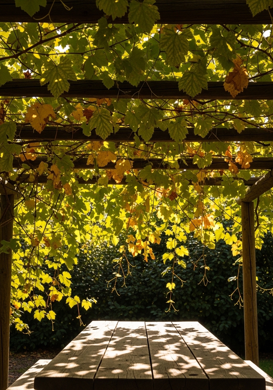 I trained grapevines across a trellis above my dining table. In summer the broad leaves create shade and a natural screen. I used pergola trellis kit 8×8 and grapevine starter vines. The green canopy feels private and edible. Styling tip: prune to shape and maintain light. Common mistake: overcrowding vines—they need airflow to avoid mildew.
