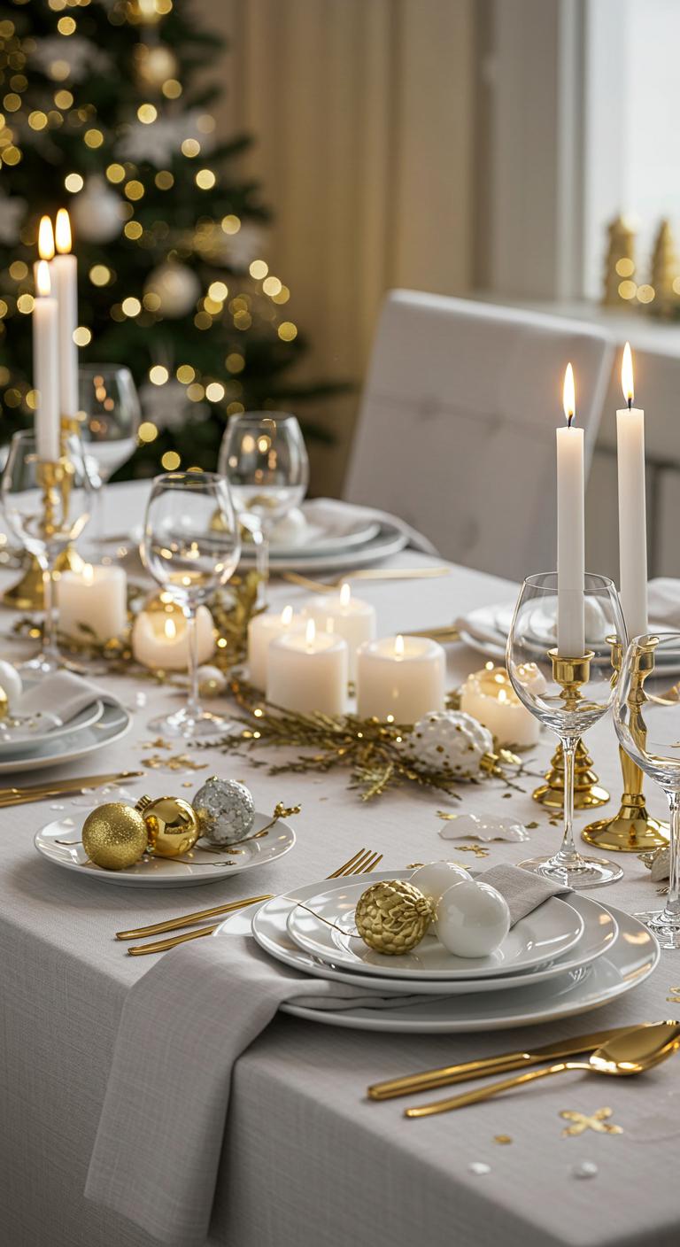 Picture elegant table settings adorned with crisp white linens, shimmering gold accents, and delicate ornaments. This stunning combination invites warmth and luxury, creating a festive atmosphere that’s both inviting and refined.