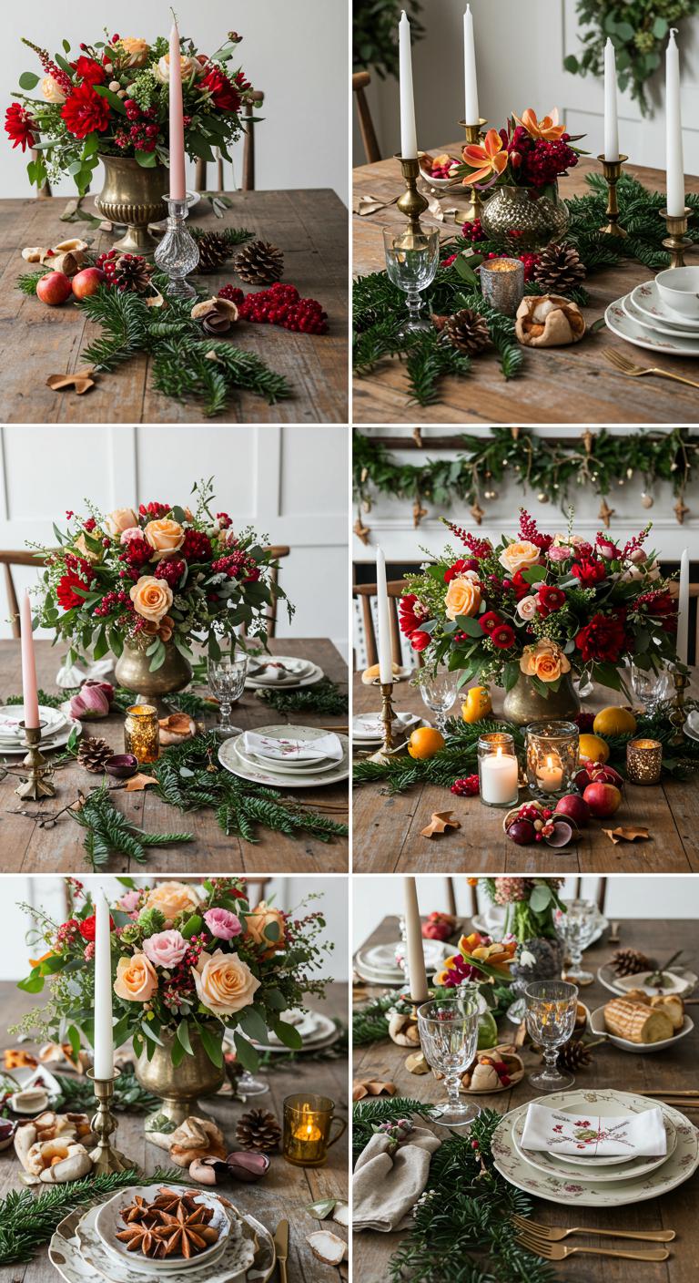 Combine natural elements like greenery accents and seasonal fruits with vibrant festive florals.