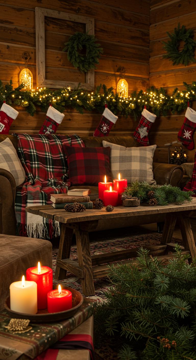 Embrace cabin cozy vibes with plaid throws, pine-scented candles, and wooden accents.