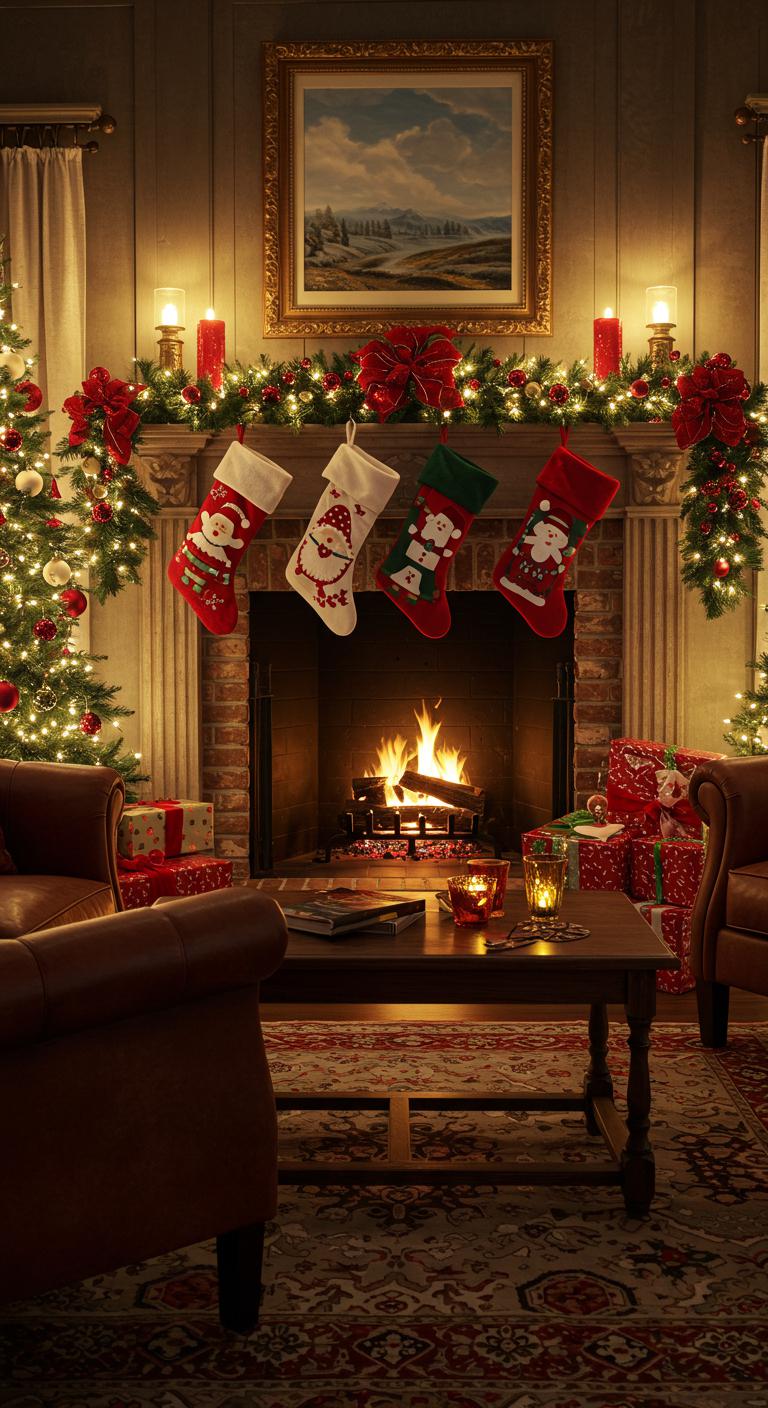 Don’t forget to hang traditional stocking designs by the fireplace, each one a nod to nostalgia.