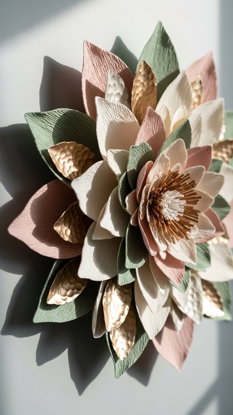 Grab some paper or thin metal sheets to craft your own 3D flowers. Start by cutting simple petal shapes and layering them for depth. This project costs under $10 in materials. Glue the pieces onto a canvas base. Hang it with removable hooks to avoid wall damage. Mix colors like pastels for a soft spring vibe. Add beads for extra sparkle if you have them. This decor pops in any corner. Try varying sizes for a dynamic look. You’ll finish in less than an hour. It’s a fun way to mimic high-end art. Use scrap paper from home to keep it cheap. Display one flower or group a few for impact. Your walls will feel lively and personal right away.