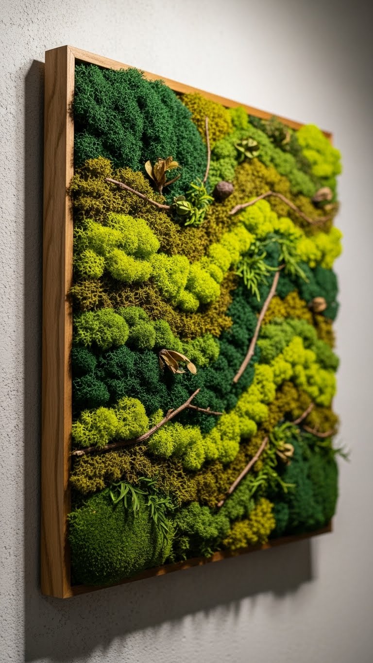 Apply preserved moss to frames. Stick it on. Hang right away. Low cost and effort. This adds green life. Choose your favorite shades. The result is fresh. Finish fast.
