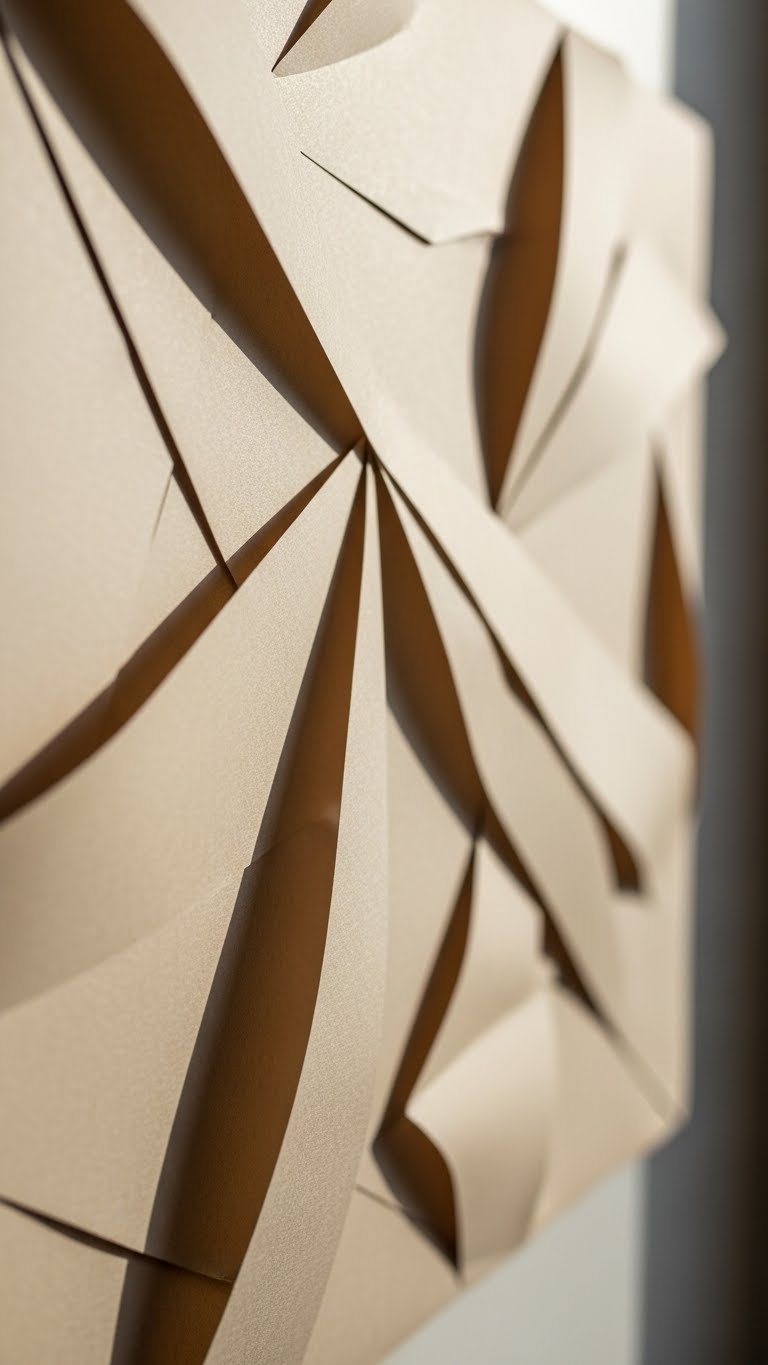 Fold or crinkle paper for texture. Glue onto a base. Frame if possible. This is very affordable. Hang with ease. It mimics more complex art. Use what you have. The look is modern and inviting. Complete fast and simple.