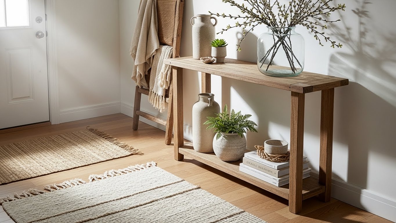 Rugs make your entry feel cozier. Start with two layers. Put a smaller one on top of a larger base. This adds depth. Shop at budget spots for pieces under $20. Look for vintage styles. They mix well. DIY hack: Cut an old rug to fit. Use fabric glue to edge it. No sewing needed. Place them by the door. They catch dirt and add style. Keep colors neutral to match. This works in tight spots. Stack carefully. The top rug should overlap slightly. It creates interest. Add a plant nearby for contrast. Your space looks put together. Change them seasonally. Roll up the old ones easy. Guests step in and smile.